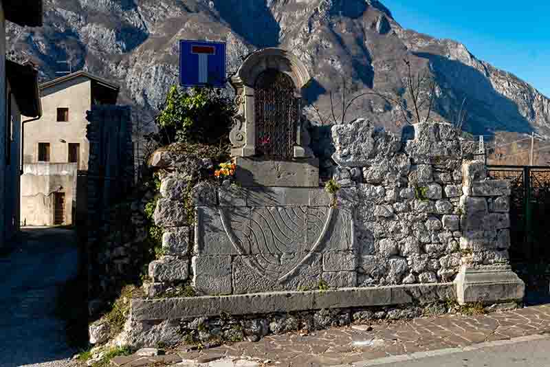 PORTA DI SOPRA (Nord): della seconda torre portaia si conserva molto poco. Demolita nel 1833 insieme alla Porta di Sotto e all’antico ponte sul Venzonassa, conserva ancora oggi due frammenti dello stemma di Venzone provenienti da quest’ultima struttura. Sul lato occidentale, è presente la porzione inferiore dello scudo costituente lo stemma, sovrapposto da un’ancona religiosa in pietra tipo arenaria; sul lato opposto, il frammento superiore dello stemma, costituito da un ponte merlato a tre fornici, sormontato da un cane, una croce e due elementi floreali ai lati. In origine, vi erano collocati anche una statua di San Giovanni Nepomuceno e i resti di un capitello, sempre provenienti dal suddetto ponte, oggi non più presenti.