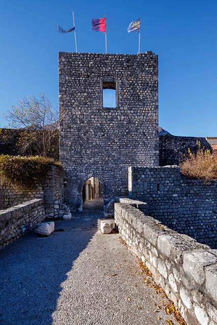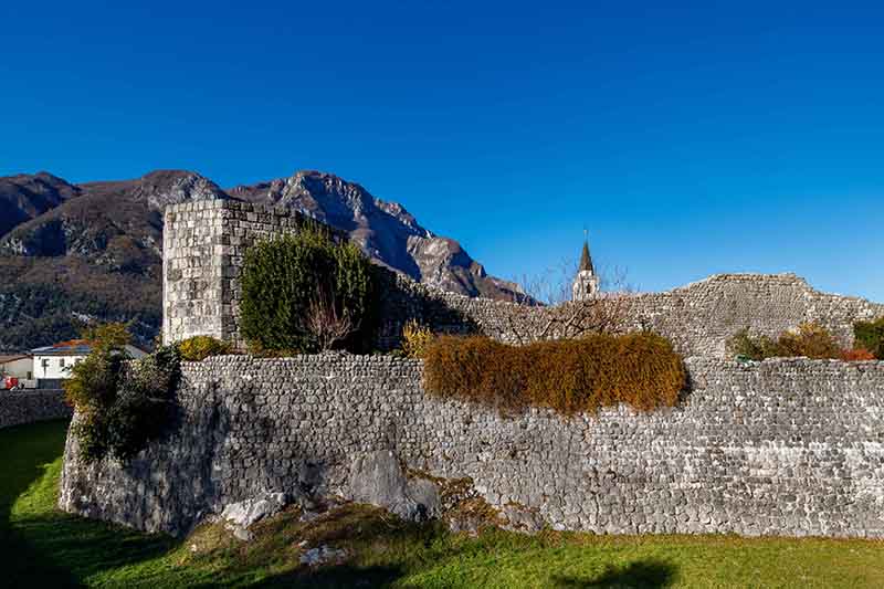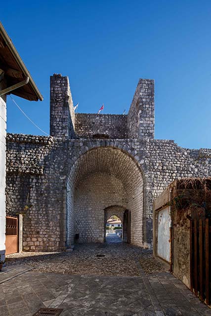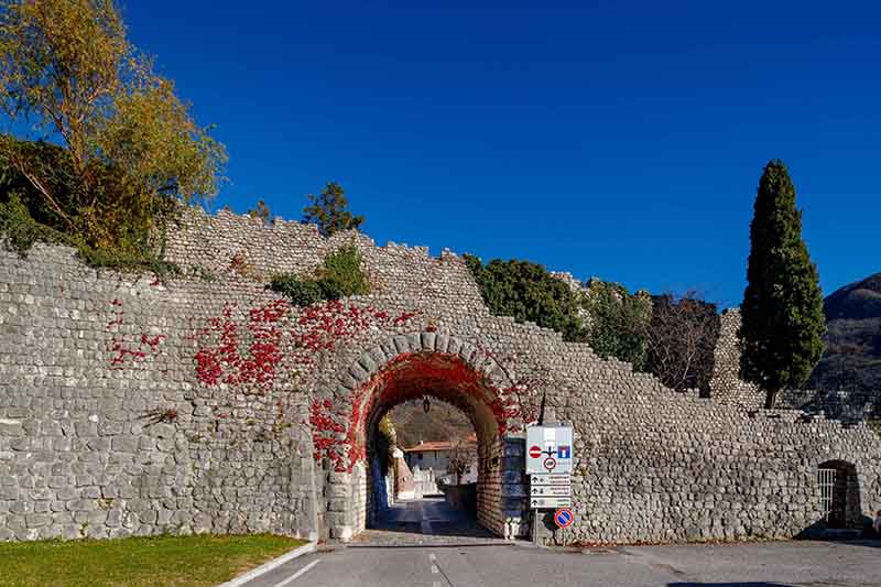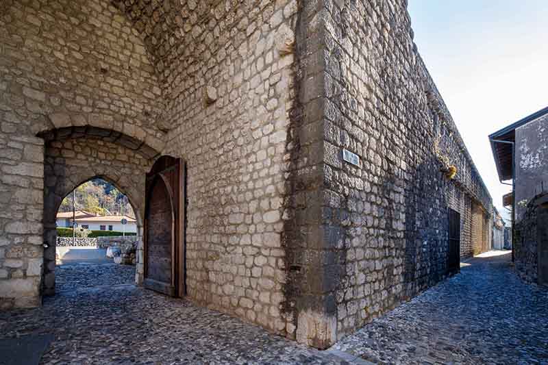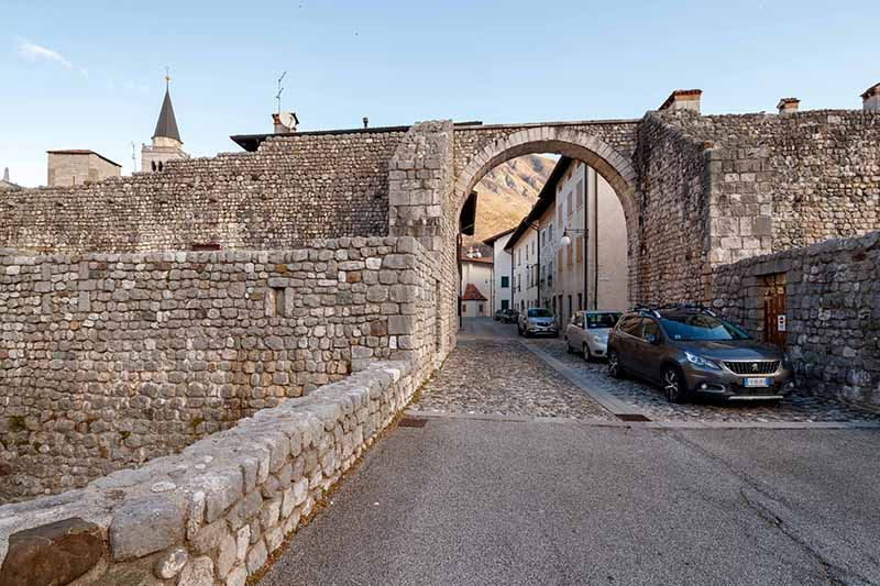 PORTA DI SOTTO (Sud): eretta in sostituzione della precedente torre portaia trecentesca, Porta di Sotto è il risultato di una ricostruzione avvenuta nel 1835. In origine costituita da una struttura voltata, la struttura attuale è costituita da un arco a tutto sesto, distrutto dal terremoto del 6 maggio 1976 e ricostruito nel 1986, come testimoniato dalla data scolpita in chiave di volta. Si conservano ancora le due spalle che costituivano l’avancorpo verso il ponte levatoio e gli accessi laterali al barbacane e alla difesa “bassa”, anch’essi con le date “1985” a sinistra e “1986” a destra scolpite sull’architrave.