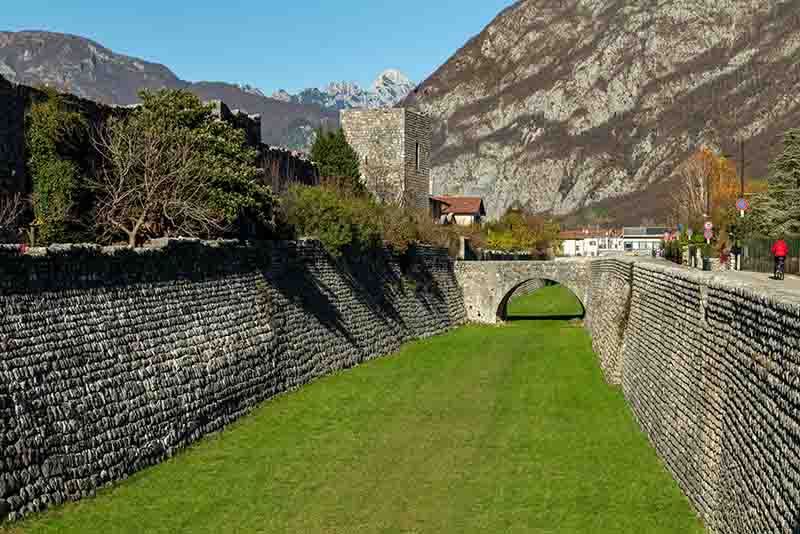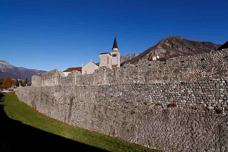 In seguito all’assedio posto dalle truppe del Patriarca Bertrando, le mura subirono lavori di rinforzo nel 1336, vanificati pochi anni più tardi: il 25 gennaio 1348, come narrato dalle cronache dell’epoca, un disastroso terremoto le danneggiò fortemente. A partire dal 1470, a causa del timore generato dalle invasioni turche, la cinta fu innalzata di circa m. 2.20, inglobando la precedente merlatura e il cammino di ronda, per far fronte alle nuove tecnologie belliche. Altri restauri furono realizzati nel 1571, come testimoniato da una targa lapidea a Nord della Porta San Genesio e epoca in cui una delle sedici torri difensive fu demolita.