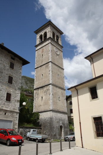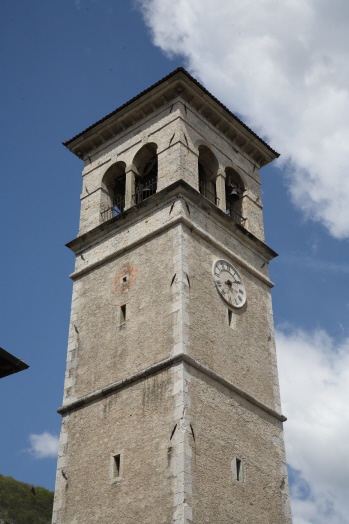torre isolata; basamento a corpo unico con pianta quadrata (muratura in pietra a vista); fusto a corpo unico con pianta quadrata (muratura in pietra a vista e intonacata), con feritoie, cornici di demarcazione orizzontali e quadrante di orologio (cifre romane, quattro:IV); cella campanaria a pianta quadrata con bifore ad arco a tutto sesto (muratura in pietra a vista e intonacata); sommità formata da copertura a quattro falde con pianta quadrata (manto di copertura in coppi); elemento apicale formato da croce e sfera metalliche
