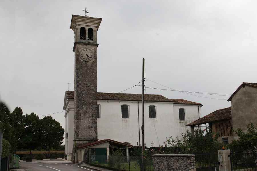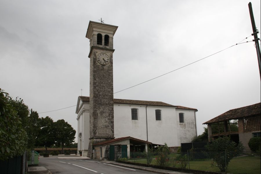 tipologia a torre separata dalla chiesa. Fusto a corpo unico con pianta quadrata e base leggermente allargata (muratura in pietra a vista), con feritoie, quadrante d'orologio in cifre romane e cornice di demarcazione orizzontale in mattoni intonacati all'imposta della cella campanaria. La cella è a sua volta a pianta quadrata con presenza di bifora, sui quattro lati, ad arco a tutto sesto (muratura intonacata). La sommità è formata da copertura a 4 falde con cornice modanata (manto di copertura in coppi); elemento apicale formato da croce metallica.