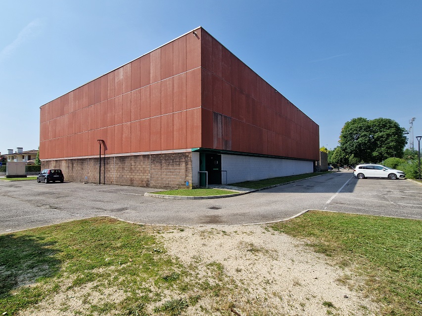 Il palazzetto, progettato nel 1985 da Glauco Gresleri e Silvano Varnier, con la collaborazione dell'ing. Giuseppe Carniello, presenta due corpi di fabbrica paralleli, ma separati e di altezza diversa: il palazzetto con le tribune disposte su uno dei lati lunghi e i sottostanti spogliatoi e un volume accessorio più basso. Il palazzetto è realizzato con muratura portante in blocchi semipieni a vista, su cui poggiano pilastri e travi reticolari metalliche che sostengono parte della facciata in pannelli metallici e la copertura in elementi prefabbricati in c.a. a shed. Il volume accessorio, caratterizzato da prospetti essenzialmente ciechi, presenta muratura portante in blocchi a vista e copertura piana. I due corpi di fabbrica sono collegati attraverso una pensilina vetrata che è anticipata da un baldacchino cin cemento armato che funge da cerniera compositiva tra gli elementi del complesso e la strada.