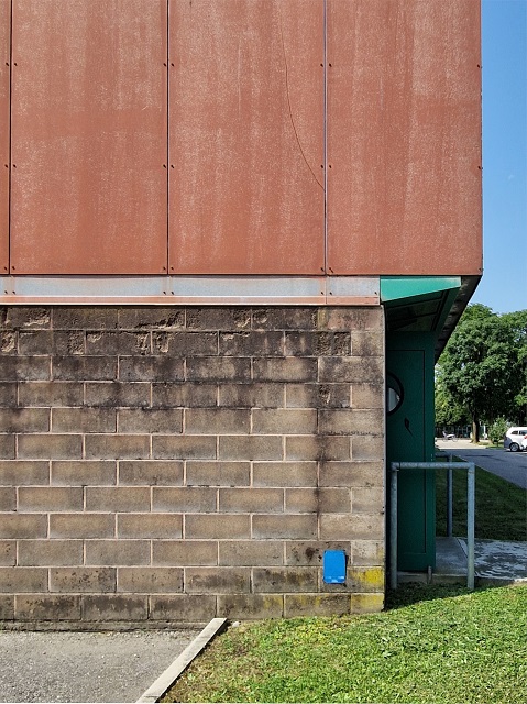 Il palazzetto presenta muratura portante in blocchi semipieni a vista, con pilastri e travi reticolari metalliche che sostengono parte della facciata in pannelli metallici e la copertura in elementi prefabbricati in c.a. a shed. Il portale d'ingresso è realizzato in c.a. Il volume degli spogliatoi è realizzato in muratura portante e solaio prefabbricato in c.a.
