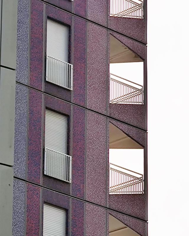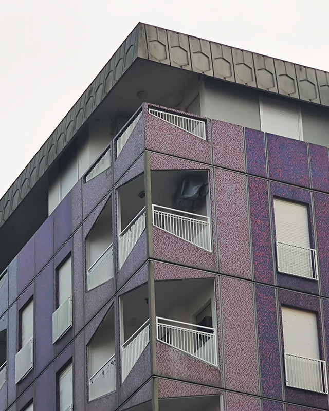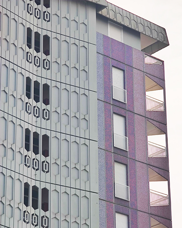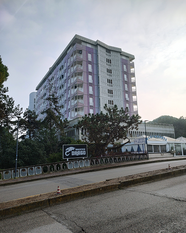 L'edificio si colloca all'interno di un'area oggetto di un'iniziativa immobiliare avviata all'inizio degli anni '60 e promossa dalla famiglia Coin e dalla società SICE di Gino Ursella (amministratore unico). L'iniziativa prevedeva che l'area lottizzata fosse suddivisa in dodici comparti, otto ricavati sul lato mare e quattro verso la laguna: i primi, riservati alla destinazione alberghiera, erano aggregati a formare una spina centrale; gli altri, a residenza turistica, servizi e attrezzature, erano organizzati a "H" e chiudevano su tre lati la grande piazza centrale (dedicata a Gino Ursella in epoca recente). Il condominio Millefiori è posizionato in un lotto racchiuso da tre viabilità: viale Centrale a nord, via Lilienfeld a est e via Millefiori a ovest. E' l'edificio di punta di quel complesso architettonico a spina che ricorda la soluzione del "Treno" di Marcello D'Olivo. Si sviluppa su dieci piani fuori terra con attività commerciali al piano terra, residenze in tutti gli altri livelli. Il primo livello sporge rispetto al piano terra, formando un ampio portico che offre riparo dal sole e dalla pioggia durante il percorso casa-spiaggia. Esso aggetta anche rispetto ai livelli superiori, configurandosi come una terrazza/ballatoio. Il secondo livello poggia su di essa tramite pilastri e funge da spazio distributivo per l'accesso ai piani successivi. I terrazzini sono "racchiusi" entro una sorta di loggia, mentre fasce colorate di varia cromia di viola caratterizzano le facciate (per tutti e cinque gli edifici della spina centrale si prevedeva una diversa colorazione dei paramenti esterni, con l'intento di differenziare e rendere meno ripetitivi i corpi edilizi). La tecnologia costruttiva è quella della prefabbricazione in cemento armato che lo stesso Gino Ursella aveva appreso in Venezuela, dove in giovane età era emigrato.