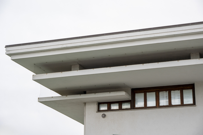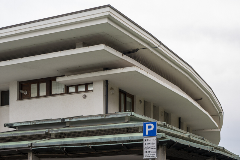 L’Edificio Fontana di Gianni Avon è stato progettato e realizzato tra il 1966 e il 1967. L'edificio si trova tra viale a Mare (quale proseguimento di Piazza del Sole) e Arco del Grecale. Si sviluppa come una prosecuzione naturale del treno commerciale di Marcello D’Olivo, a definire la testata verso il mare. Si sviluppa su due piani: al piano terra sono collocati i locali commerciali aperti su di uno spazio porticato; il primo piano è destinato a uso residenziale. La caratteristica principale di questo edificio è il forte senso di orizzontalità, sottolineato sia dalla copertura a pagoda sia dal controsoffitto in legno a listelli che decora il portico, concepito come uno spazio accogliente e ombreggiato, quasi domestico. Il legno, materiale caldo e naturale, contribuisce a rendere questo ambiente a misura d'uomo. L’elemento più rappresentativo dell’edificio è sicuramente la fontana a gradoni, collocata sul prospetto sud. Le vasche disposte su più livelli si articolano in sequenza decrescente, a partire dalla copertura, a chiudere la testata del complesso, fino a terra. La logica a gradoni della fontana è ripresa dal tetto con cui dialoga, diventando anche un elemento compositivo. Questa scelta conferisce all’edificio una leggerezza visiva, inserendolo nel paesaggio urbano con eleganza e semplicità. I materiali utilizzati sono il cemento, il klinker come elemento di rivestimento e il legno. L’architettura di questo edificio è volutamente aperta al pubblico, con l’intento di creare spazi di relazione. Una relazione che, attraverso l’uso dell’elemento acqua, si configura in modo fondamentale anche con l’ambiente.