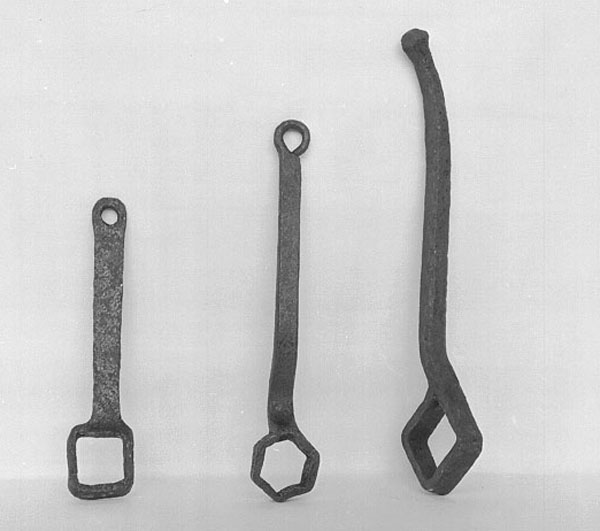 Tre chiavi poligonali: la prima con estremità quadrangolare e manico dritto munito di occhio; la seconda con estremità esagonale e manico leggermente curvato teminante con occhiello; la terza con estremità romboidale e manico a sezione quadrata terminante con un piccolo pomello.