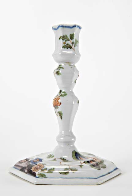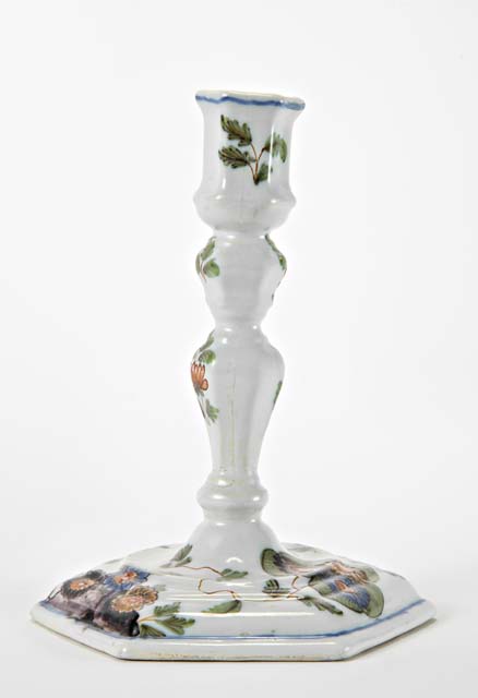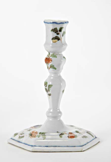 Due candelieri di maiolica fine, con pasta bionda e vernice sottile. La base è esagonale e lo stelo sagomato. Decorazione a fiori, singoli o a gruppi di tre, nei colori azzurro intenso, viola e rosso ruggine, con foglioline verde spento.