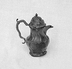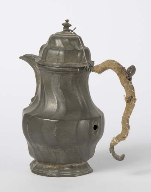 Piccola cioccolatiera di peltro, decorata con nervature ondulate sul corpo, sulla base e sul coperchio. Sulla copertura motivo floreale a rilievo. Coperchio incernierato.