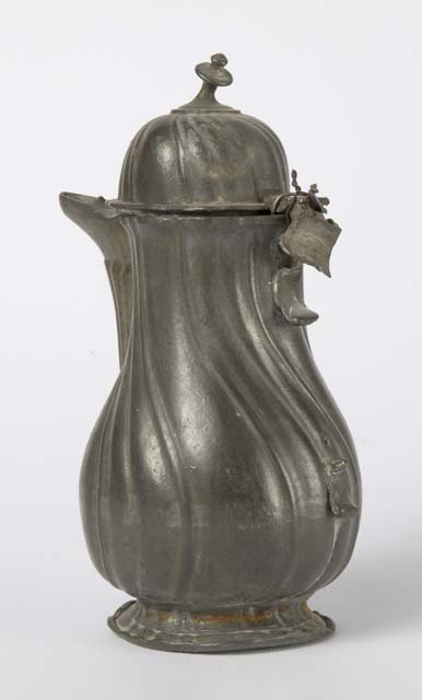Elegante cioccolatiera in stile rococò probabilmente di fattura tedesca (cfr. Mory 1964, fig. 169). Il pezzo può essere stato prodotto anche da manifatture che risentivano dei modelli tedeschi, austriache ad esempio, o anche locali (per notizie sui peltrai di Gorizia si veda la scheda 6288).
