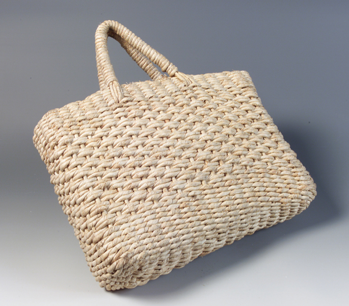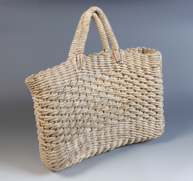 La sporta presenta il caratteristico colore giallo della paglia; é di forma rettangolare e presenta due manici ricurvi al centro dell'apertura.