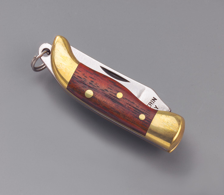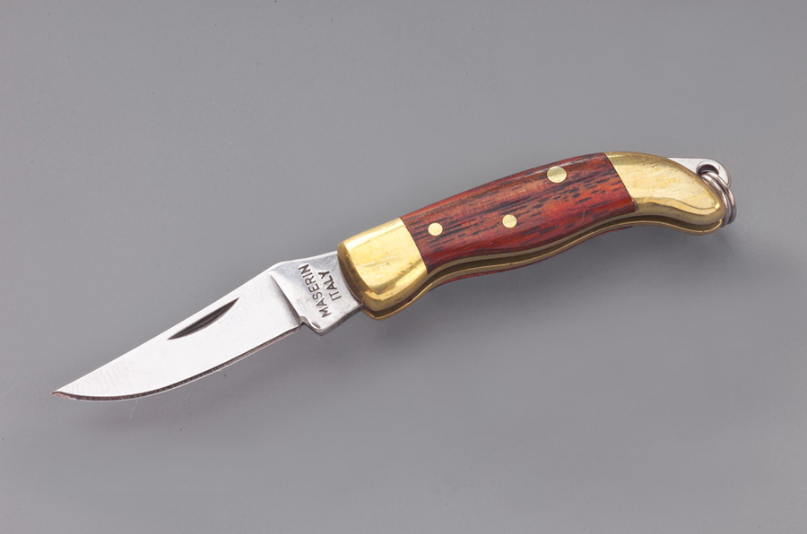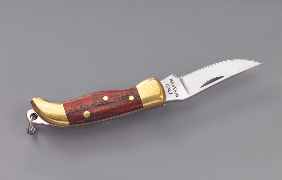 La lama a punta rovesciata ha tagliente liscio, costa piatta con smentatura, sezione cuneiforme, #posta# di protezione e ugnata. La smentatura inizia subito dopo il tallone. Il manico è dato da una molla semplice in acciaio e da due guance, che fungono anche da cartelle interne. Le guance hanno in ottone le #mòstris# superiori ed inferiori mentre lo spazio fra il metallo è riempito con un inserto in legno. Quest'ultimo è fissato con tre rivetti in ottone. Il manico sagomato con due denti di presa termina con nasello al calcagno. La molla della lama fuoriesce dal manico con un'aletta forata in cui passa l'anello per appendere il coltello.