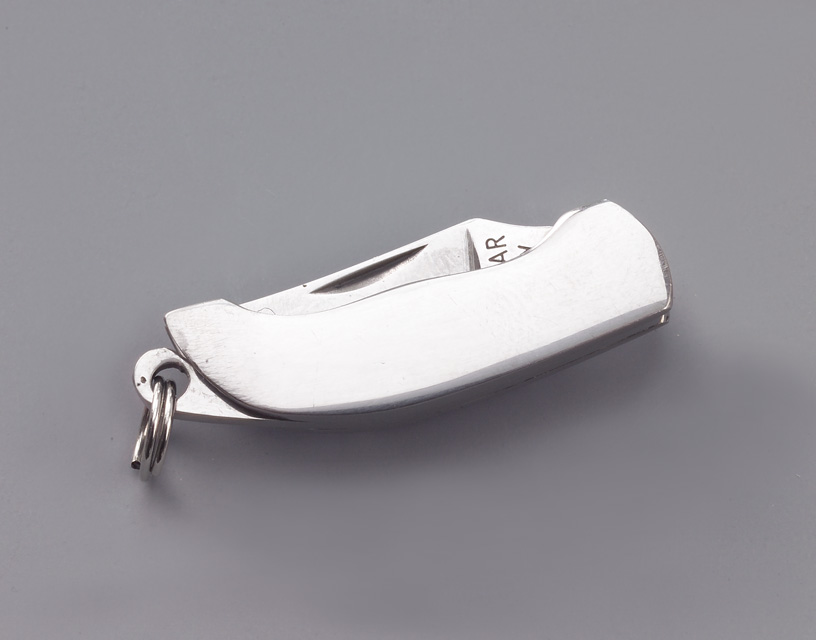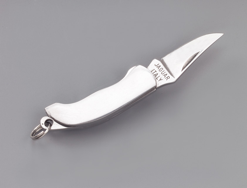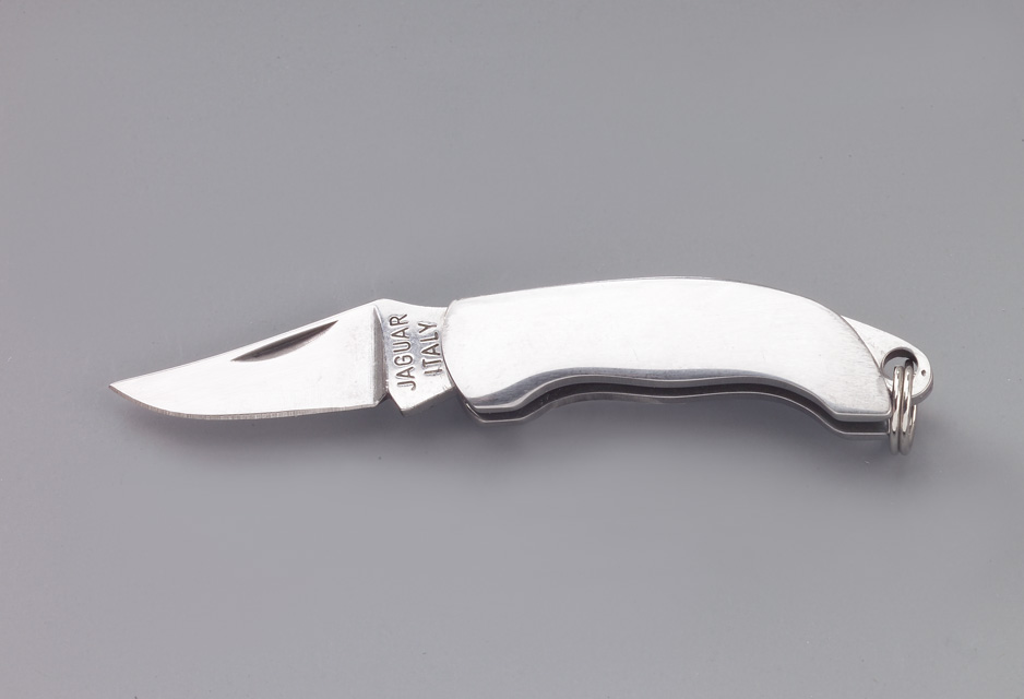 La lama ha punta rovesciata, tagliente liscio, costa piatta, sezione cuneiforme, #posta# di protezione e ugnata. La larghezza della lama è massima in corrispondenza della #posta#, di qui in poi scende con una smentatura fino alla punta. Il manico è dato da una molla semplice e da due guance che fungono anche da cartelle interne. Il manico, sagomato con due denti di presa, termina con nasello al calcagno. Tutte le parti del coltello sono d'acciaio. La molla fuoriesce dal calcagno con un'aletta forata dove è infilato l'anello per appendere l'oggetto.