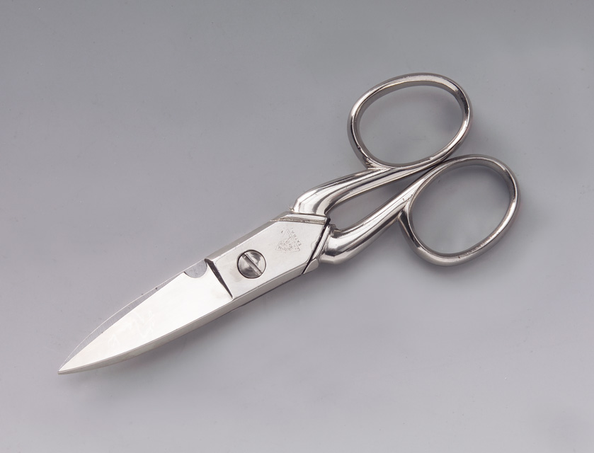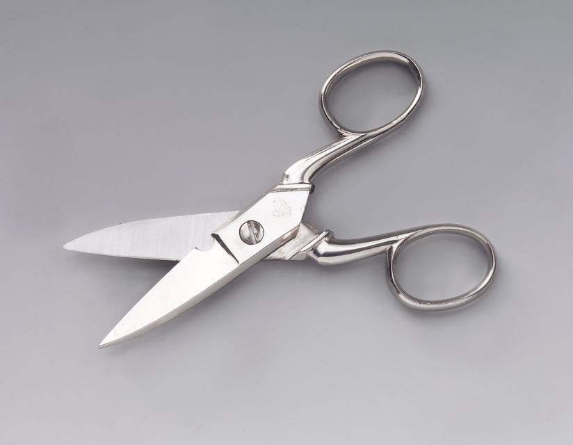 Le forbici sono costituite da due gambi imperniati a croce che si aprono e si chiudono mediante il movimento esercitato dalle due dita inserite negli anelli alla base degli stessi. Gli occhi sono ovali; i gambi sono piuttosto corti, rispetto alle lame, e tozzi. Sullo scudo è visibile la vite che funge da cerniera. Le due lame hanno tagliente liscio, costa obliqua e sezione a cuneo. Su una delle lame il filo inizia con una tacca semicircolare.