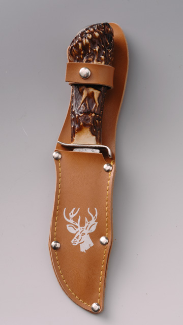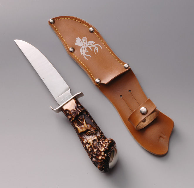 Il fodero è dato da due pezzi di cuoio uno più lungo per il dorso ed uno più corto per il fronte. Le due parti, sagomate secondo la forma della lama, sono cucite a formare la tasca. La parte del dorso, che sporge oltre la tasca, presenta due tagli verticali paralleli che definiscono il passante con cui agganciare il fodero alla cintura. Poco sopra il passante è borchiata la fascetta di sicurezza chiudibile con un automatico. Cinque borchiette rinforzano la cucitura della tasca e decorano il fodero stesso.