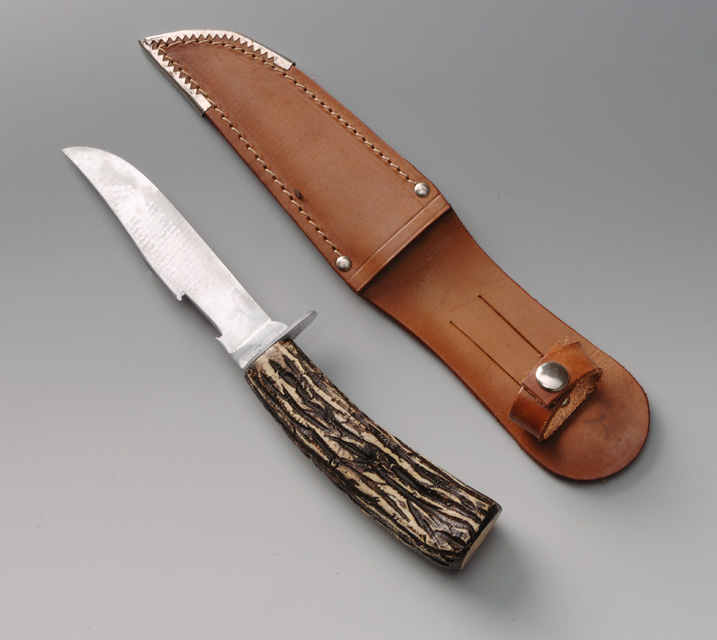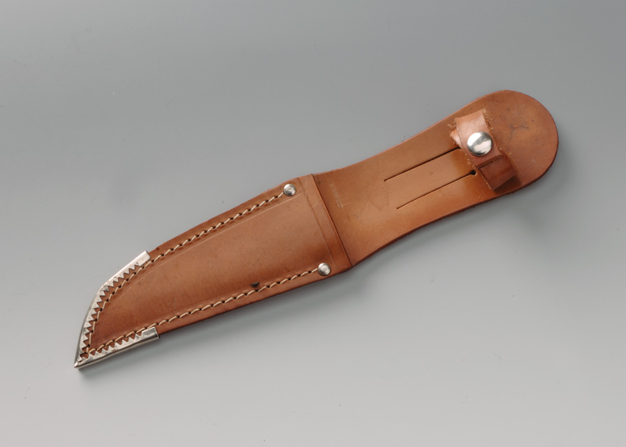 Il fodero è dato da due pezzi di cuoio uno più lungo per il dorso ed uno più corto per il fronte. Le due parti, sagomate secondo la forma della lama, sono cucite a formare la tasca. La parte del dorso, che sporge oltre la tasca, presenta due tagli verticali paralleli che definiscono il passante con cui agganciare il fodero alla cintura. Poco sopra il passante è borchiata la fascetta di sicurezza chiudibile con un automatico. La punta della tasca è rinforzata da un profilo metallico, mentre due borchiette rinforzano la bocca della tasca.