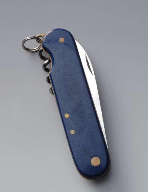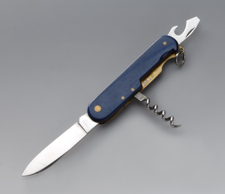 La lama a punta spianata ha tagliente liscio, costa piatta, sezione cuneiforme, #posta# e ugnata. Il levacapsule è ad uncino, sulla punta della sua lama c'è il cacciavite a taglio. Il cavatappi a spirale consiste in un'asta a cui fa seguito il verme elicoidale. Il manico si compone di una molla semplice in acciaio; due cartelle interne in ottone; due guance di plastica blu. Le componenti del manico sono fissate con quattro rivetti in ottone. Un'aletta forata, inserita nello spessore tra il levacapsule e la cartella interna, fuoriesce dal profilo del manico, in essa è infilato l'anello per appendere lo strumento.