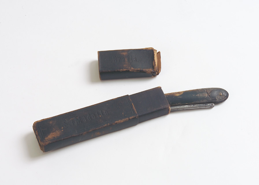 Custodia di cartone rigido di colore marrone atta a contenere il rasoio.