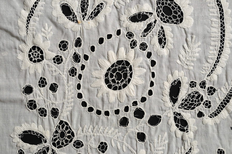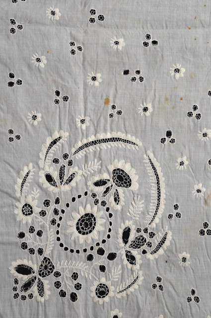Il fazzoletto, confezionato con tela di lino bianca, è di forma quasi quadrata, con due lati ripiegati (cm 0.3) e orlati a sottopunto e i due opposti rifiniti a cappe smerlate. Un fitto ricamo orna solamente uno degli angoli con vari motivi floreali: una margherita, con corolla centrale a reticella, è inserita in una cornice a elementi circolari, attorno alla quale si snoda un festone con fiori dalle grandi corolle a reticella e fitti petali, sottili steli con bacche e foglie aghiformi, che si alternano creando una composizione ovale. Tutt’attorno sono disposti a scacchiera piccoli fiori polilobati, alternati a elementi circolari con interno a reticella. I due lati interessati dal decoro presentano un largo festone, composto da nastri perlinati sinuosi inframezzati da fiori e foglie. Il profilo, finemente rifinito a cappette, reca su ciascuno smerlo una larga corolla fiorita.