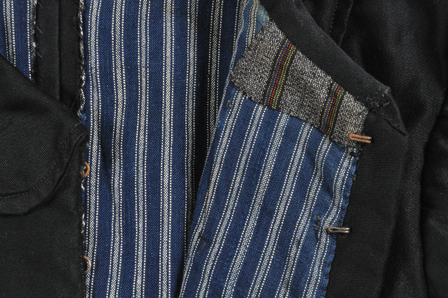 Il giacchino è confezionato con tessuto di cotone nero e si compone di quattro teli sagomati sulla parte posteriore, due sui laterali e due sul davanti. Quest’ultimi presentano ciascuno tre pieghe, parzialmente cucite solo su metà altezza. La chiusura è nascosta dal profilo sormontato e si compone di nove gancetti, e altrettante asole, in metallo; il collo è tondeggiante, le maniche, ampie e leggermente arricciate sul girospalla, si restringono progressivamente verso il fondo. Internamente il giacchino è foderato in tela di cotone rigata blu e in tela di cotone rigata grigia.