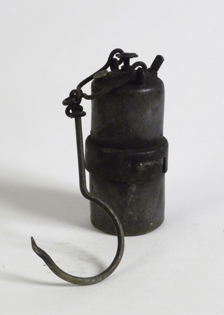 Contenitore cilindrico costituito da due parti comunicanti: un serbatoio per l'acqua (parte superiore) e un contenitore per il carburo di calcio in polvere (parte inferiore). In questo caso le due parti sono fermate da un innesto a baionetta. Mediante un apposito rubinetto è possibile regolare l'ingresso dell'acqua nel contenitore sottostante. Appena il carburo entra in contatto con l'acqua avviene una reazione chimica con produzione di acetilene (gas infiammabile), che fuoriesce da un beccuccio situato nella parte superiore.