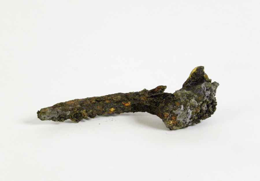 Oggetto in ferro a sezione quadragolare, con testa piatta e punta incurvata dall'uso