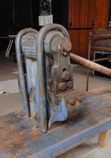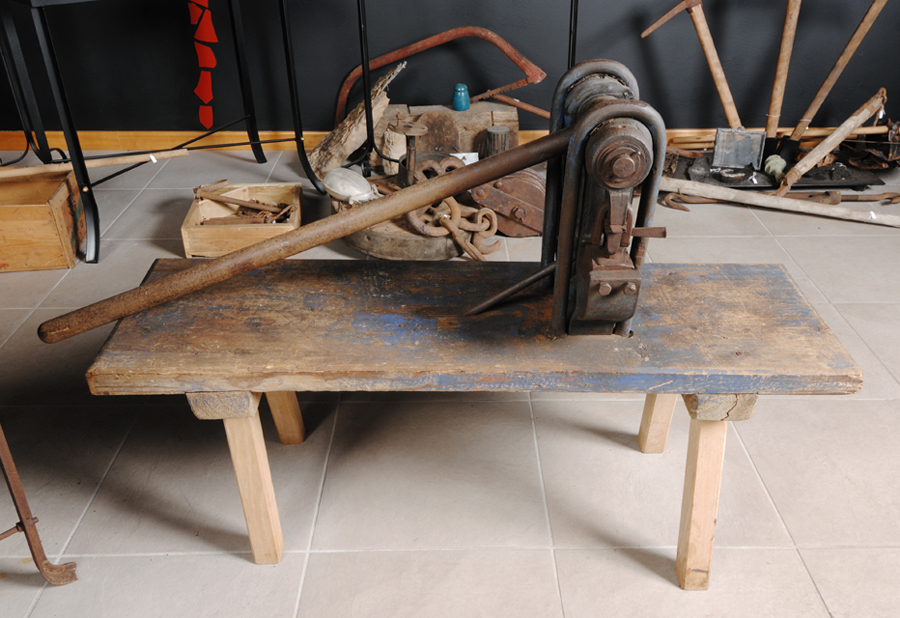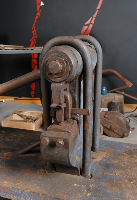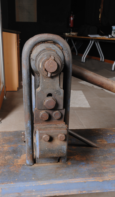 Robusto congegno metallico, avente forma ad U, fissato a un piano di legno sorretto da quattro piedi. Il congegno si aziona mediante un pesante manico, onde esercitare una forte pressione, tale da forare una lastra metallica.