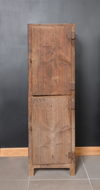 Mobiletto semplice e rudimentale, a più mensole, con due ante verticali.