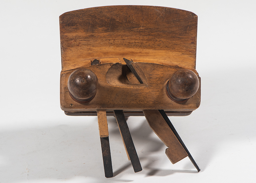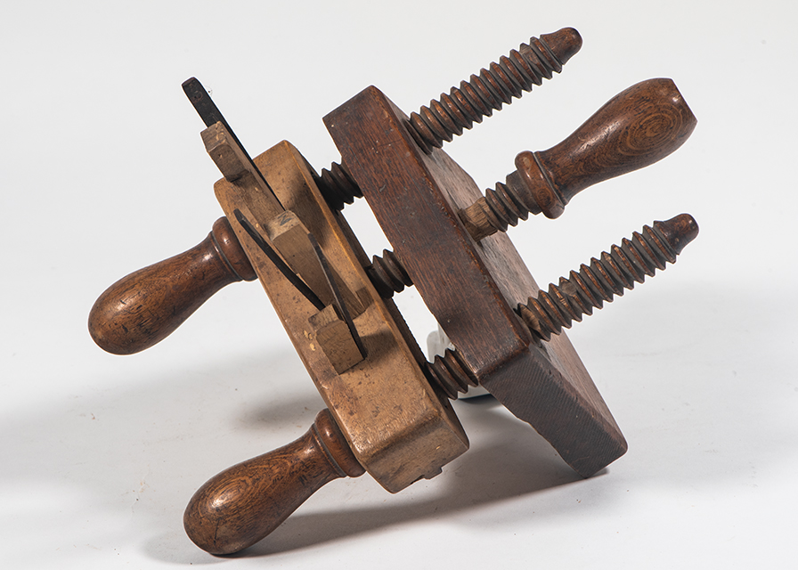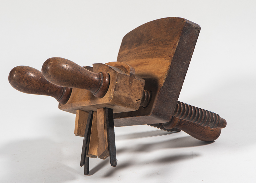 Questo caprugginatoio, detto anche incastro per fondi a regolatore, presenta il corpo e le viti in legno, la barra guida in legno e le lame in acciaio. Per regolare la distanza tra il portautensili a tavoletta (parte con le lame) ed il riscontro, prima si agisce sulle due viti e poi si regola la controvite. Le viti sono in legno diverso dal corpo, forse in melo o pero, comunque un legno a grana fine che permetta la filettatura.