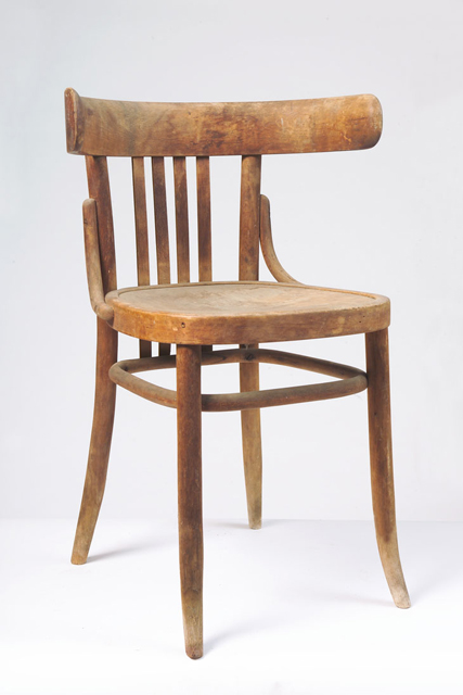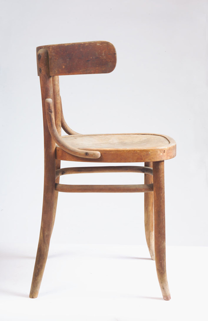 Sedia in legno verniciato, con vernice di colore scuro; sedile in legno, incassato nella struttura; schienale in legno, curvato in avanti e collegato al sedile tramite elementi lignei curvati a sezione circolare, con assi decorativi verticali a collegamento di schienale, sedile e anello sottoseduta. Gambe a sezione circolare, lievemente curvate e rastremate in prossimità degli appoggi, collegate tra loro da anello sottoseduta a sezione circolare.