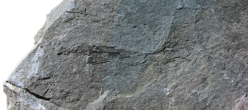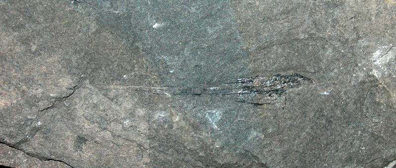 Cranio con mandibola articolati e conservati su lastra e controlastra. Si usa qui il termine lastra e controlastra perchè l'originario frammento di strato si è aperto in due parti lungo il piano di sedimentazione che contiene il resto fossile in modo che questo è rimasto sia su di una parte sia sull'altra. E' definita lastra la parte più grande; l'altra parte è la controlastra. Saurichthys è un pesce dal corpo caratteristicamente allungato, dalla testa molto grande e con una parte rostrale lunga e sottile, con una pinna caudale piccola, pinne pelviche posizionate vicino alla pinna caudale e quasi opposte alla pinna dorsale. In questo esemplare potrebbero essere conservati anche segmento della colonna vertebrale articolato al cranio e le pinne pettorali, ma sono ancora coperte dalla roccia.