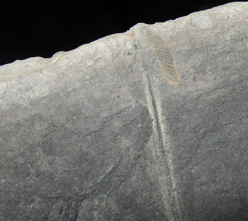 Scheletro parziale e articolato di pesce e possibile coprolite conservati su lastra e controlastra. Si usa qui il termine lastra e controlastra perchè l'originario frammento di strato si è aperto in due parti lungo il piano di sedimentazione che contiene i resti fossili in modo che questi sono rimasti sia su di una parte sia sull'altra. E' definita lastra la parte più grande; l'altra parte è la controlastra. Saurichthys è un pesce dal corpo caratteristicamente allungato, dalla testa molto grande e con una parte rostrale lunga e sottile, con una pinna caudale piccola, pinne pelviche posizionate vicino alla pinna caudale e quasi opposte alla pinna dorsale. In questo esemplare è conservato il cranio con la mandibola (ma ancora in gran parte coperti dalla roccia) e un piccolo segmento della colonna vertebrale con i resti delle pinne anale e dorsale. Un resto organico lungo circa 6,5 mm, a forma di salsiccia e apparentemente segmentato viene qui interpretato come un coprolite (escremento fossile), in analogia a quanto fatto per un resto simile conservato in MFSNgp53537 (scheda 119). Tuttavia, in entrambi i casi non è escluso di tratti di un invertebrato dal corpo segmentato (per esempio, un 'verme').