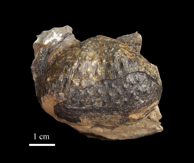 Valva peduncolare di brachiopode productide su frammento di calcare nero siltoso.