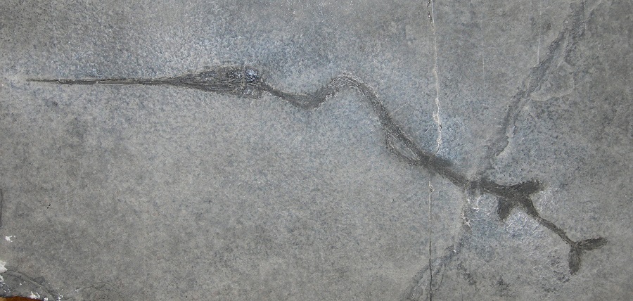 Scheletro completo e articolato conservato su lastra di calcare nero. Saurichthys è un pesce dal corpo caratteristicamente allungato, dalla testa molto grande e con una parte rostrale lunga e sottile, con una pinna caudale piccola, pinne pelviche posizionate vicino alla pinna caudale e quasi opposte alla pinna dorsale.
