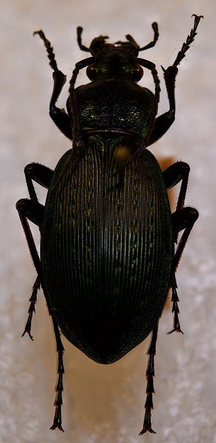 Coleottero carabide con corpo allungato, addome largo, mandibole sviluppate e antenne lunghe fino al primo terzo dell'addome. Torace con appendici molto corte ai due lati nella parte posteriore. Occhi di colore bruno, sviluppati e sporgenti ai lati del capo. Elitre caratterizzate da coste longitudinali sottili, poco rilevate, alternate ad altre segmentate. Colore nero opaco con marcati riflessi color verde smeraldo metallizzato.