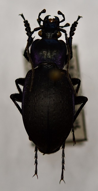 Coleottero carabide di medie dimensioni, con corpo allungato, mandibole sviluppate e antenne lunghe fino al primo terzo dell'addome. Torace con appendici carenate ai due lati nella parte posteriore. Occhi di colore giallastro, sviluppati e sporgenti ai lati del capo. Elitre caratterizzate dalla presenza di coste molto sottili e poco evidenti, intervallate da altre segmentate più visibili. Colore nero opaco con riflessi viola metallizzato sui margini esterni del torace e delle elitre.