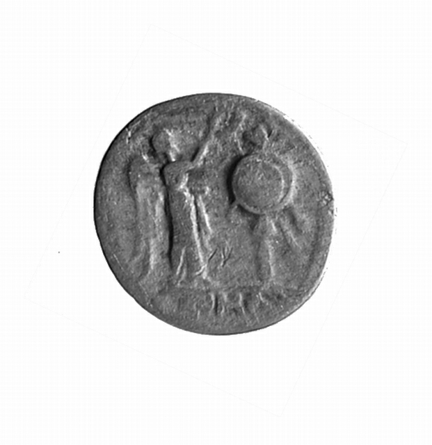 Vittoria che incorona trofeo d'armi; corn. lin.