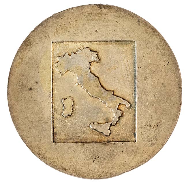 Entro un riquadro rettangolare inciso, sagoma a rilievo della penisola italiana e delle isole.