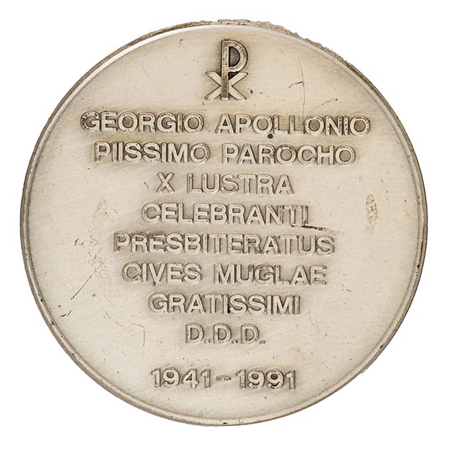 (monogramma chi rho) / GEORGIO APOLLONIO / PIISSIMO PAROCHO / X LUSTRA / CELEBRANTI / PRESBITERATUS / CIVES MUGLAE / GRATISSIMI D.D.D. / 1941-1991