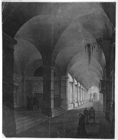 Atrio con pilastri quadrati e volte a crociera in primo piano e loggiato con colonne doriche in fuga prospettica. Sette figurine animano la scena: cinque frati nel lungo sottoportico, un frate e un uomo in costume ottocentesco (giacca a redingote e cilindro) accanto alle lapidi nell'atrio. Più o meno sottili tratteggi a china e acquerello grigio tortora con effetto di monocromo nelle sfumature, nei giochi di chiaroscuro, nell'abbozzo della facciata architettonica in fondo al colonnato. Carta giallina, a grana media. Controfondato.