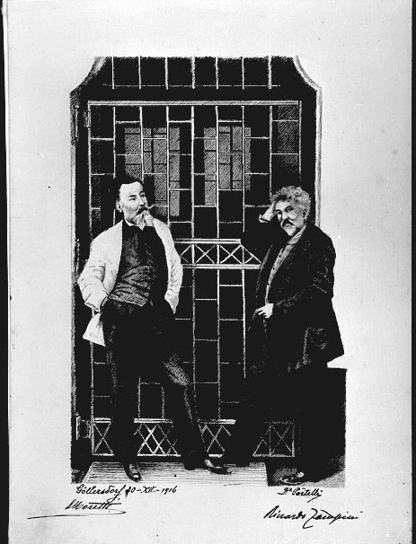 I due uomini (che si firmano sotto il ritratto) sono raffigurati in piedi davanti a un cancello. Quello a sinistra tiene le mani n tasca, quello a destra appoggio il gomito destro al cancello e si porta la mano alla fronte. Carta color avorio a grana media.