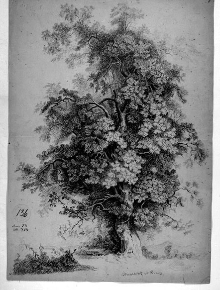 La maestosa quercia giganteggia come protagonista assoluta del disegno, nonostante l'accenno a un paesaggio collinare in bassi a destra. Carta ocra chiaro, a grana grossa; uso sapiente del carboncino soprattutto nella resa del chiaroscuro. Della scritta della filigrana è visibile solo una parte.
