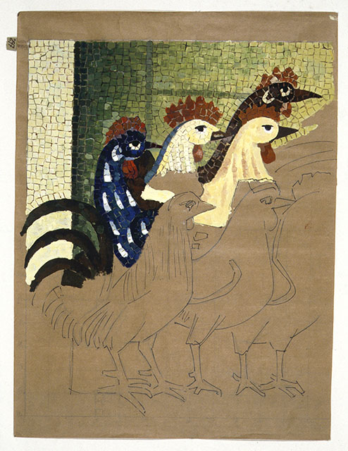 Il cartone raffigurante "Galli e galline" fu realizzato da Nane Zavagno come saggio didattico per gli allievi della Scuola Mosaicisti. Esso riproduce un particolare dei soggetti musivi che decorano le ricche superfici parietali della Basilica di San Marco a Venezia: è un una copia parziale della rappresentazione della volta sud, pensata, insieme alla cupola e alle lunette, per esporre narrativamente la "Creazione" e la "Preistoria umana " (1 215-1225). Dell'originale l'artista conserva lo straordinario colorismo pittorico nella resa degli animali, mentre interpreta liberamente lo s fondo, sostituendo le tinte naturali dei riquadri marciani con bianchi brillanti e verdi intensi. Il mosaico di smalto applicato su cemento fu eseguito da gli allievi del IV Corso, frequentanti la Scuola del Mosaico nel 19 62-1963. Fu venduto, poi, al signor Bersani di Lione (Francia) il 7 maggio 1963 (reg.1, part.2473, reg.3, part.2473). Oltre a "Galli e galline", furono numerose le copie di mosaici marciani che gli allievi della Scuola del Mosaico realizzarono in laboratorio, per compensare la nobiltà e la finezza dell'arte antica con tecnica moderna: nel 1965-1966 "Testa di ancella" (reg.1 , part.2863, reg.3, part.2863), nel 1967-1968 "Figura ieratica" (reg.1, part.2970, 2971; reg.3, part.2970, 2971), nel 1968-1969 "Figura femminile" ( reg.1, part.2984, reg.3, part.2984), nel 1969-1970 "Figura maschile" (reg.1, part.3024, reg.3, part. 3024), nel 1976-1977 "Testa di Santa" (reg.1, pa rt.3595, reg.3, part.3595), nel 1982-1983 "Creazione degli uccelli" (reg.4 , part.4246), nel 1984-1985 "Creazione dei pesci" (reg.4, part.4247), nel 1987-1988 "Drago con pesci" (reg.4, part.4596), nel 1988 "Uccello" (reg.4, part.4602).