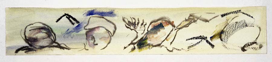 Il bozzetto presenta un tenue color giallo di fondo su cui campeggiano scarne e semplificate immagini, disegnate a carboncino, ispirate al mondo della natura: una cima compare in fondo a sinistra, mentre a destra montagne degradanti sono disposte con linea discendente verso sinistra, fino ad incrociare al centro un albero spoglio: sono rese plastiche delle ombre a carboncino e ad acquerello rosso. In primo piano a sinistra sono abbozzati due volti femminili chiaroscurati con acquerello rosa e stagliati su un alone di color azzurro evidenziato da stesure di colore blu cobalto.
