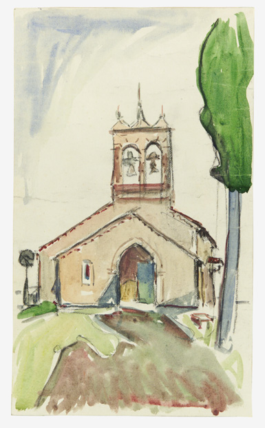 Chiesetta campestre con cella campanaria bifora. Un sentiero sterrato conduce al portale d'ingresso. Caratterizzano l'ambiente il cielo grigio, una panchina ai piedi di un alto cipresso in primo piano sul lato destro, un albero in lontananza sul lato sinistro.