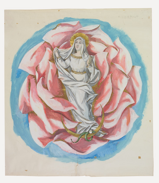 Cartone raffigurante il particolare centrale della decorazione musiva della cupola della Cappella della Madonna nel Santuario di Madonna di Rosa a San Vito al Tagliamento (PN). La Madonna appare tra i petali avvolgenti di una rosa. Con il piede sinistro schiaccia la serpe avviluppata sulla falce di luna.