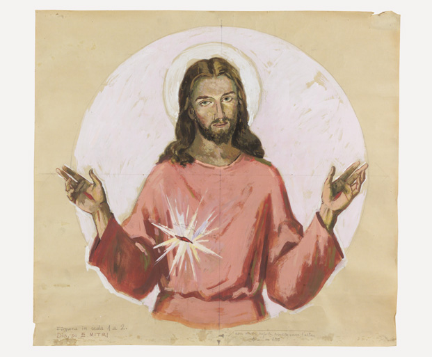 Figura centrale della cupola della cappella di Gesù Misericordioso nel Santuario di Madonna di Rosa di San Vito al Tagliamento: Cristo a mezza figura con le braccia aperte e la ferita sul costato risplendente.