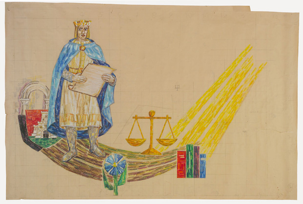 Composizione allegorica composta da un re stante in abiti medievali, con la corona sul capo e una pergamena retta con entrambe le mani; alle sue spalle, in basso, è raffigurato uno stemma con un castello e, più indietro, un portale. Davanti alla figura si dispongono un fiore stilizzato blu, una bilancia dorata e quattro libri dei quali si vede il dorso. Sulla destra dall'alto discendono tre raggi di luce obliqui. Il foglio è quadrettato a matita.