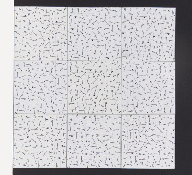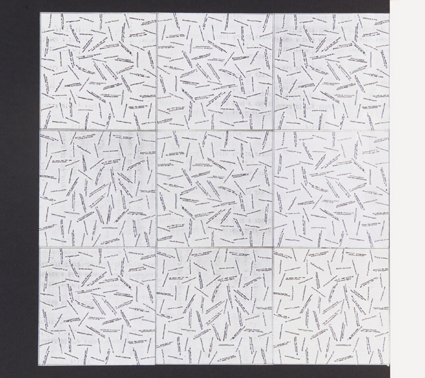 Entro due riquadri sono raffigurati dei frammenti a foggia di bastoncino disposti con inclinazioni diverse ma quasi equidistanti fra loro.