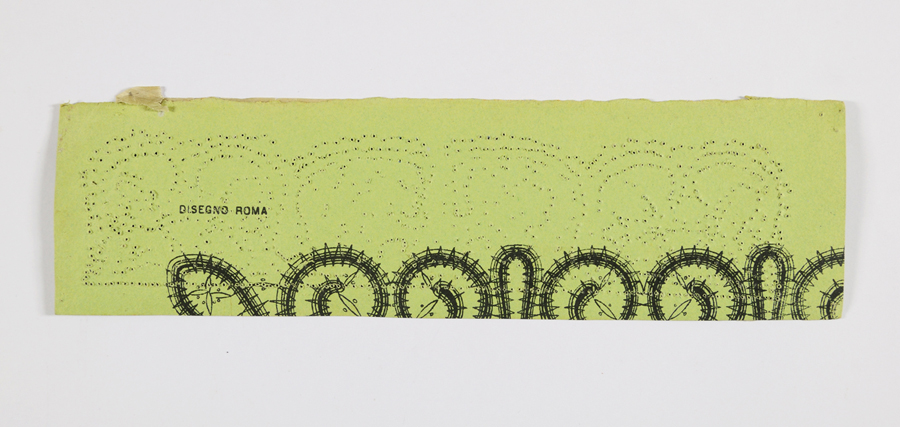 1) Abbigliamento: polsino. Il disegno è eseguito su una carta velina, incollata su un cartoncino verde di riutilizzo recante i disegni e le didascalie stampate della scuola cooperativa di Brazzà. Il decoro, a sviluppo simmetrico, è composto da un motivo trilobato racchiuso in due foglie frastagliate da cui si staccano motivi sinuosi speculari. Piede dritto e festoni continui lungo il bordo. Il cartoncino presenta i fori degli spilli a testimonianza dell’utilizzo.