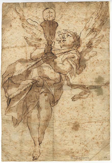 Il foglio raffigura un angelo in volo, visto da sottinsù, che regge il calice con l'ostia.